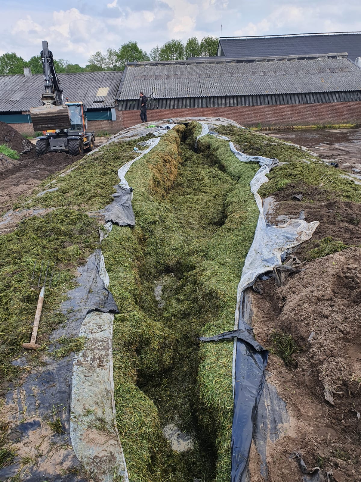Unsere Empfehlung ist, den Riss bzw. Graben z.B. mit einer Schaufel so nach-arbeiten, dass man die Miete gut mit Folie zudecken kann. Dazu Kanten und Seiten begradigen und leicht abschrägen, so dass die Folie gut auf der Miete aufgebracht werden kann. Als Orientierung: Der Querschnitt sollte ein großes „M“ bilden. Zur Sicherheit an den Innenseiten der Flanken ein granuliertes Siliermittel gegen Nach-erwärmung (z.B. Kaliumsorbat, RaicoSil Extra) aufstreuen. Folie dann gut fixieren. Erlaubt es die Größe des Grabens, an der tiefsten Stelle innen die Folie mit mehreren Silosäcken fixieren.